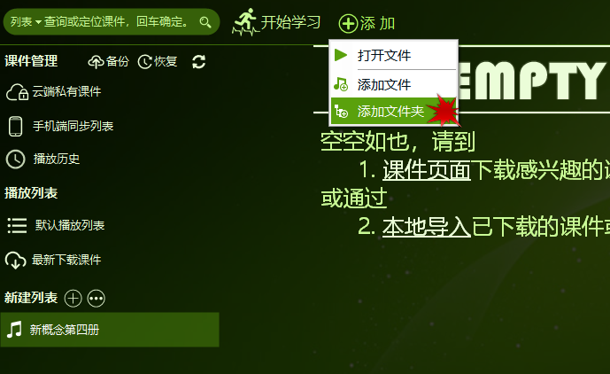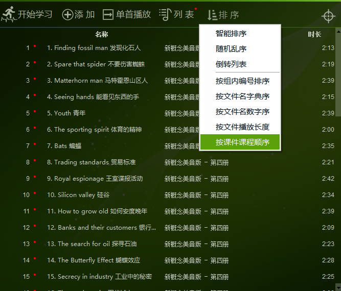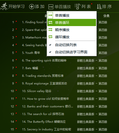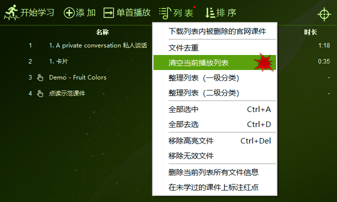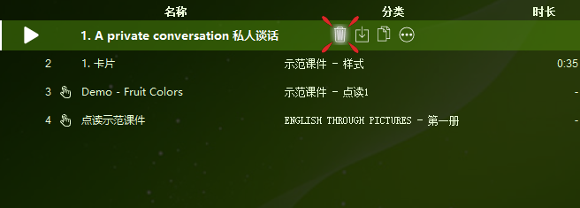 在播放列表中选择课件,在浮动工具栏上点击播放图标,进入学习模式。