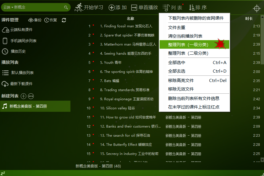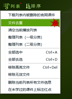 按照课件的 一级分类 或者 一级分类-二级分类 重新整理当前列表,该操作会创建按照课件信息自动创建新列表,并将当前列表中的课件挪到新列表中。