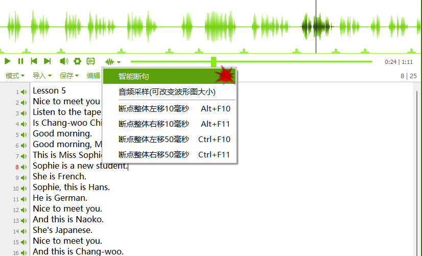 切分成两句:按住CTRL,在波形图的相应位置单击鼠标左键,句子一分为二的同时,会添加一个新行,方便编辑切分后的句子。