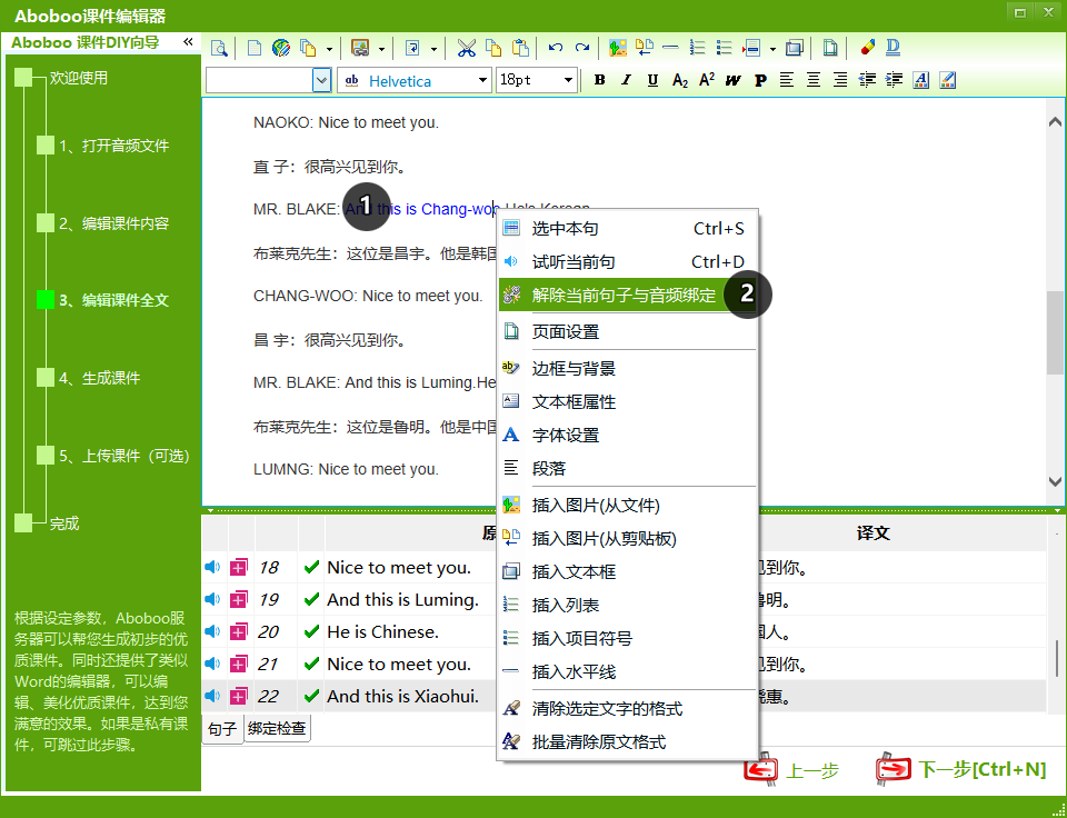 已绑定的内容可以手工解除,在已绑定内容上单击鼠标右键弹出菜单,选择 解除当前句子与音频绑定 :