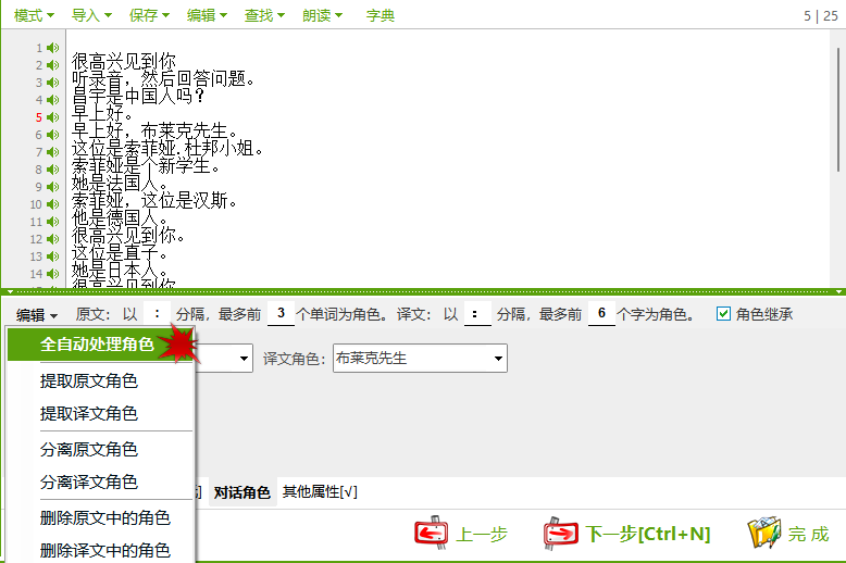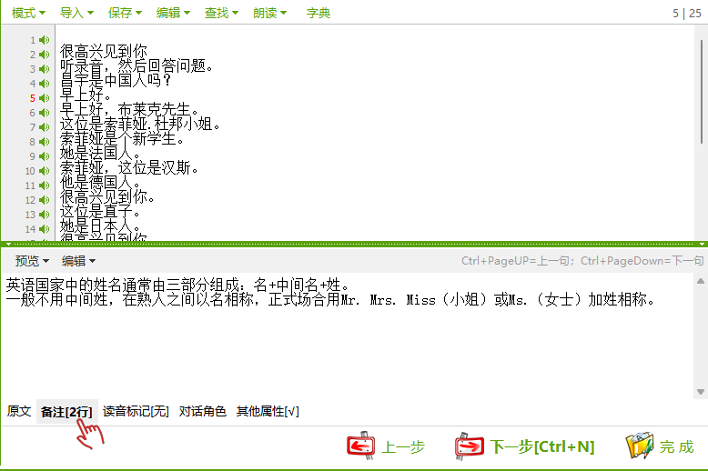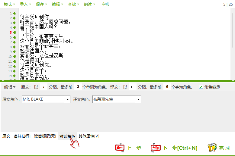 ③ 句子属性页:编辑注释、读音标记、对话角色、是否选中播放等与句子相关的属性。