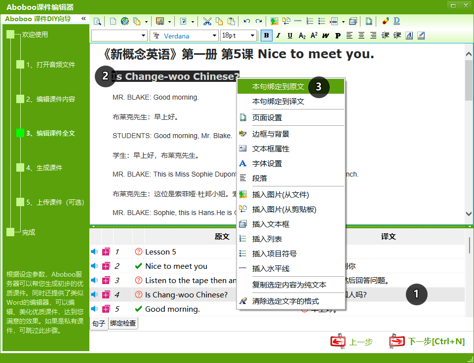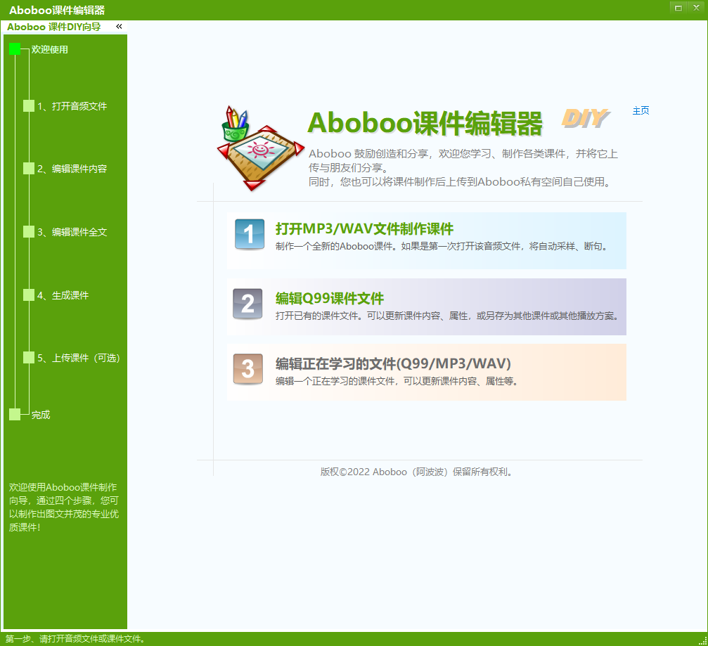 进入 Aboboo 课件DIY 向导,制作课件的五个步骤在左侧的向导树上,绿色亮块是当前所在步骤: