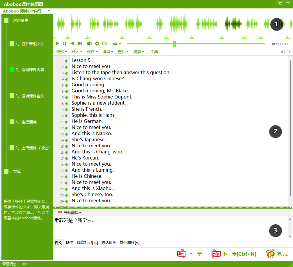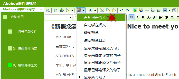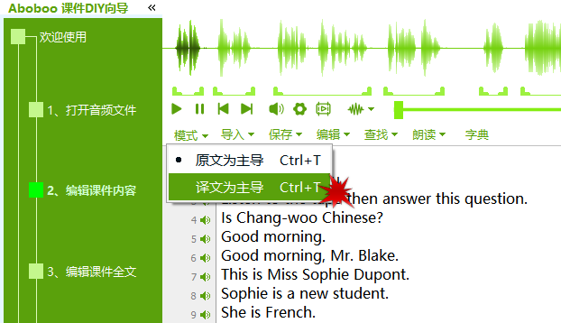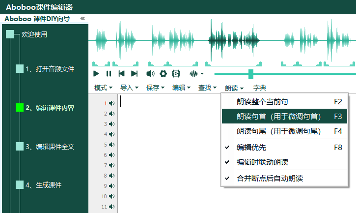课件编辑 -> 第一步:打开音频文件 -> 3 编辑正在学习的文件 。