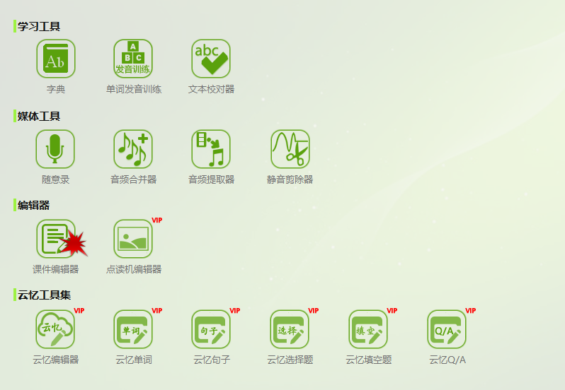 点击顶部工具栏的 工具 进入工具界面,点击 课件编辑 。