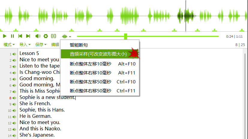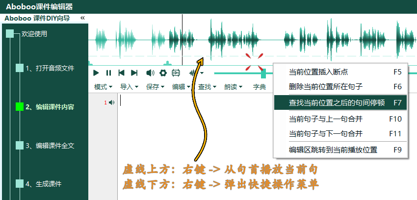 当操作以波形图为主时,单击鼠标左键,从点击位置朗读;单击鼠标右键,朗读整个当前句。