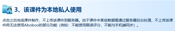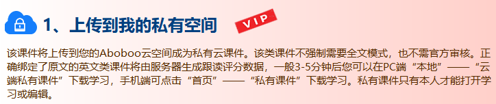 上传到您的Aboboo云空间成为私有云课件。该类课件不强制要求全文模式,也不需要官方审核。