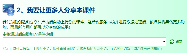 一个高质量的课件,很难一次完工,需要多次编辑。如果在第四步的已经保存工作成果,你可以直接关闭编辑器,也可以选择 2 对不起,该课件是私人使用 ,退出编辑器,下次打开这次保存的课件继续编辑,等完善以后再上传。