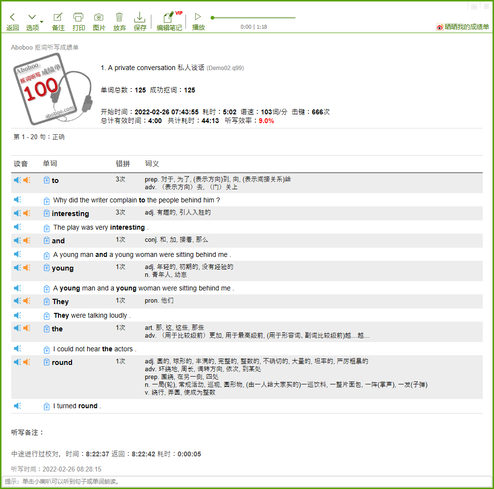 听写完毕后,点击 ,得到成绩单: