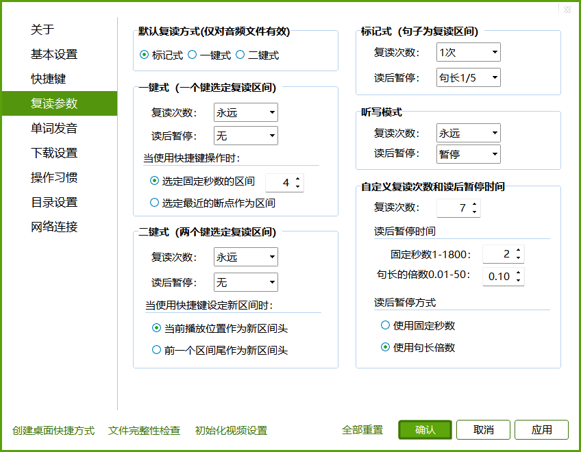 刚开始练习听力,什么都听不懂,每句话都要复读,请使用标记式复读(默认的复读方式)。