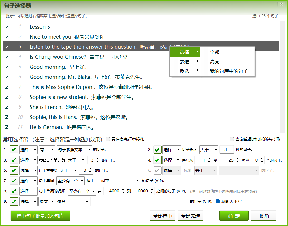 标记式复读时,有些音频含有固定的片头、片尾、音乐、现场采访等,这些内容不用逐句复读,事前用 句子选择器 去掉: